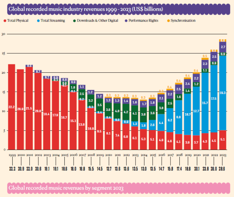 The IFPI (International Federation of the Phonographic Industry), the organisation that represents the interests of the recorded music industry worldwide, in its Global Music Report, State of the Industry 2024 (https://globalmusicreport.ifpi.org/) described the global recorded music market as worth $28.6 Bn in 2023, with streaming 67.3% of that total.