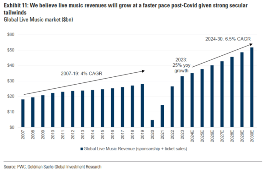 Whilst there is no authoritative global live music report, Goldman Sachs in ‘Music in the Air’ (01.05.24) reported that the global live music revenues (including event sponsorship and ticketing) in 2023 equated to $33.1Bn (https://www.goldmansachs.com/pdfs/insights/pages/music-in-the-air–focus-on-monetisation,-emerging-markets-and-ai–updating-global-music-industry-forecasts-f/music-redaction.pdf).