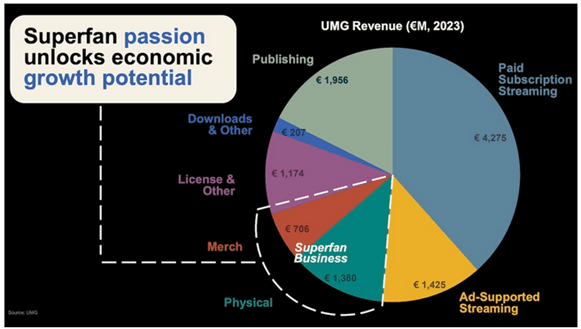 In September 2024, at the UMG Capital Markets Day at Abbey Road Studios, Grainge highlighted the segment of its business attributable to superfans in 2023 (which UMG defined as merchandise and physical sales) which totalled €2.08Bn – or 18.7% of overall revenues.