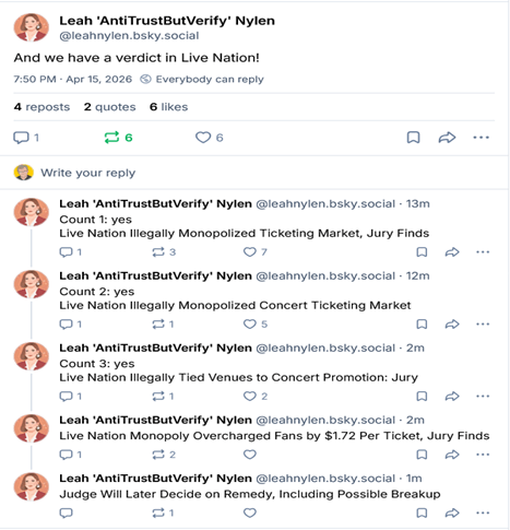 So, it had been a couple of busy days, with projects from Amsterdam, then Sheffield and finally London all demanding a level of consulting care and attention, and I was finally home, having some supper, routinely checking the email, and then Leah Nylen (Bloomberg Newsjournalist and specialist in antitrust and corporate investigations) posted on Bluesky Social: ‘And we have a verdict in Live Nation!’