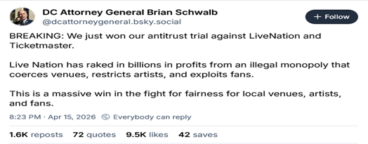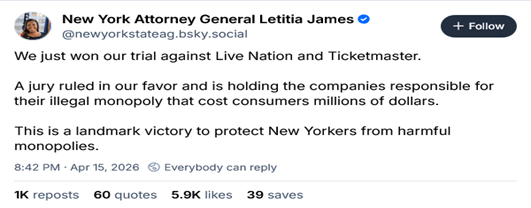 An hour or so after the original verdict announcement, LNE responded (Statement From Live Nation Entertainment, 15th April 2026 – https://newsroom.livenation.com/statements/statement-from-live-nation-entertainment/) with a statement that claimed, ‘The jury’s verdict is not the last word on this matter.’