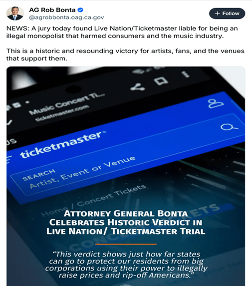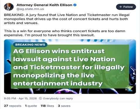 Whilst digesting the initial media coverage from NBC News (Live Nation illegally monopolized ticketing market, jury in antitrust trial finds, Allie Canal, Chloe Atkins and Adam Reiss, 15th April, 2026 – https://www.nbcnews.com/business/consumer/livenation-illegally-monopolized-ticketing-market-jury-antitrust-trial-rcna273714), The Hollywood Reporter (Live Nation Loses Jury Trial to States In Monopoly Case, Ethan Millman, 15th April 2026 – https://www.hollywoodreporter.com/music/music-industry-news/live-nation-trial-verdict-1236561243/), Rolling Stone (Live Nation Verdict: Jury Says Concert Giant Is An Illegal Monopoly in Total Defeat, Bill Donahue, 15th April 2026 – https://www.billboard.com/pro/live-nation-verdict-ticketmaster-loses-antitrust-trial/), and Deadline (Live Nation Is An Illegal Monopoly, Jury Decides; CA AG Calls Verdict “Historic & Resounding Victory For Artists, Fans”, Dominic Patten, 15th April 2026 – https://deadline.com/2026/04/live-nation-monopoly-trial-verdict-1236861889/), it quickly became apparent that despite the withdrawal last month by the Department Of Justice (DOJ) from the court proceedings (as part of settlement with Live Nation which agreed to a $280M fine as well as some contractual changes governing amphitheatre management, ticketing rights and associated capped ticket service fees), some thirty-four US States who continued with the lawsuit had successfully convinced the nine-person jury that Live Nation-Ticketmaster is an illegal monopoly, and had overcharged US ticket-buyers.