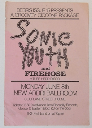 Over to Dave …’Sonic Youth between 1985 to 1987 were brilliant, undoubtedly the best rock band I’ve ever seen. As usual I couldn’t stop at just being a fan. With Nathan McGough, I promoted their gig at the Boardwalk in Manchester in May 1986 at the Boardwalk and then, with Tim Chambers, in June 1987 at the Ardri Ballroom in Hulme. Two of the best nights of my life. After the Ardri gig the band slept on the floor of my flat in Hulme. How freakin’ brilliant is that? – Dave Haslam (https://www.davehaslam.com/Old/Old/Sonic_youth.html
