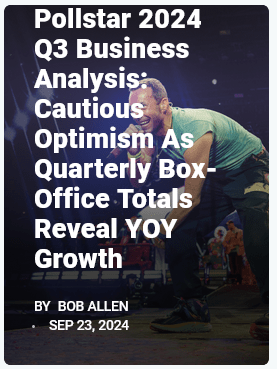 Separately, this week Pollstar reported on its Q3 2024 box office data, in particular based on the Top 100 Touring Artists: ‘Cautious Optimism As Quarterly Box-Office Totals Reveal YOY Growth – (https://news.pollstar.com/2024/09/23/cautious-optimism-in-2024-q3-business-analysis-quarterly-box-office-totals-show-year-over-year-growth/).