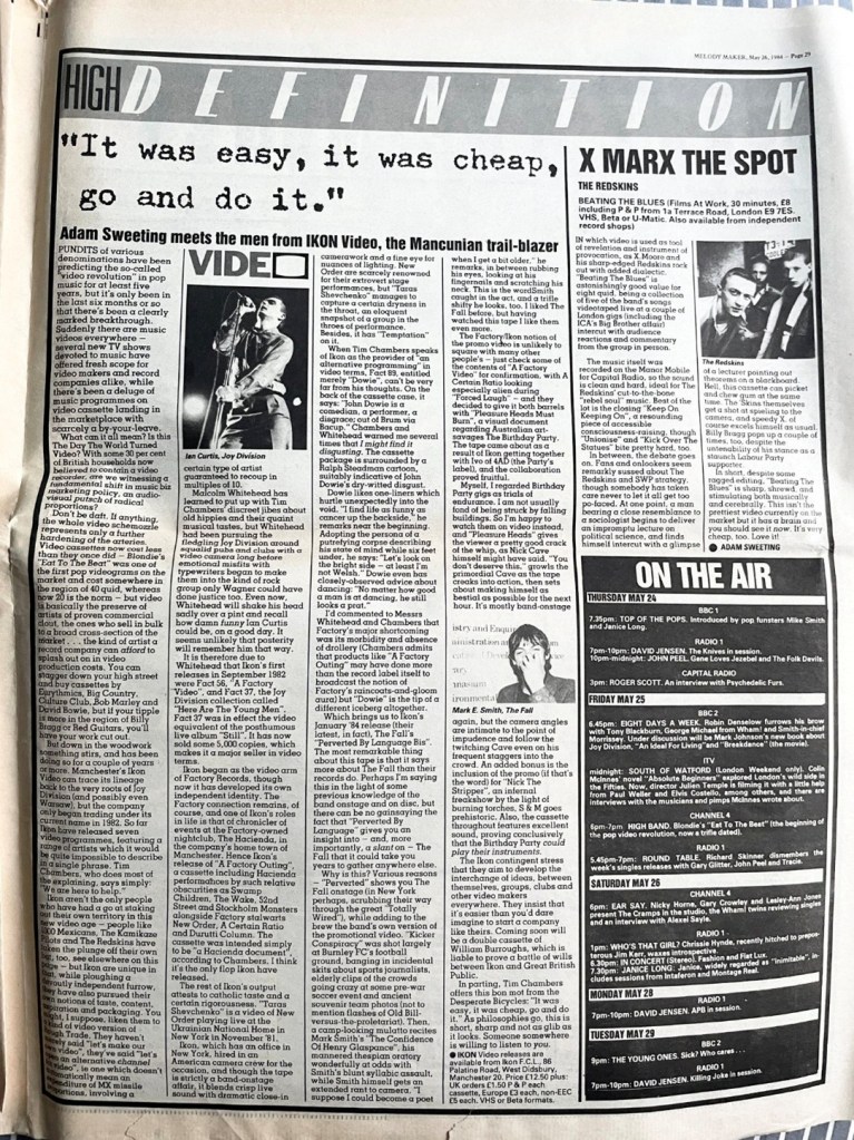It existed despite almost living in exile from Factory, and consistently having little-to-no budget, the Northern bloody mindfulness and scrappy independence combined to produce a bewildering visual catalogue. The resultant range and diversity of (lo-fi) video and films that IKON generated is a testament to you all’.