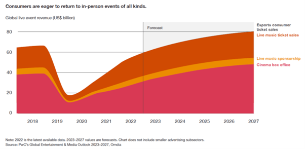 As PwC asserted (27th June 2023) in their ‘Global Entertainment & Media Outlook 2023–2027 (www.pwc.com/outlook) report, ‘Going out is in again’.